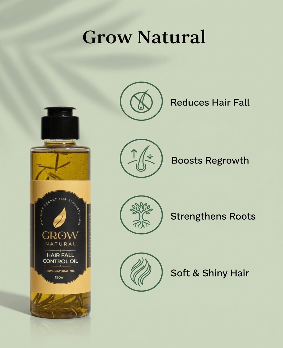 As these ingredients work together, Grow Natural becomes a powerful elixir that visibly reduces hair fall, supports regrowth in thin or slow-growth areas, and soothes the scalp while controlling dandruff. With consistent use, your hair begins to transform — becoming naturally soft, silky, shiny, and noticeably stronger from the roots.